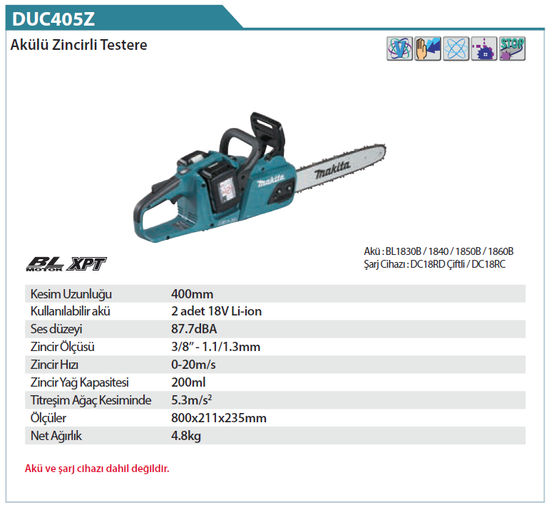 Makita DUC405Z 18V Akülü Zincir Testere (Aküsüz) 40cm