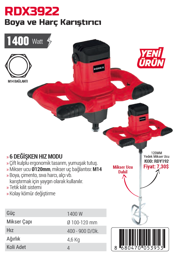Rodex RDX3922 1400W Boya ve Harç Karıştırıcı